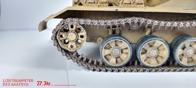 Un kit fort intéressant par son originalité et n'étant disponible que chez Trumpeter à cette échelle. Des patins de chenilles qu'il faut dégrapper un à un et nettoyer, néanmoins les chenilles sont fonctionnelles et agréables à monter !!! une planche de photodécoupe comme à l'accoutumé avec beaucoup de détails. Cependant les instructions de montage manquent de clarté comme d'habitude, mais avec un peu de bonne volonté et un peu plus de patience tout ira bien. peintures appliquées camouflage désert : Tamiya Desert Yellow XF-59 + du Blanc mat XF-2 et du Jaune Mat XF-3.